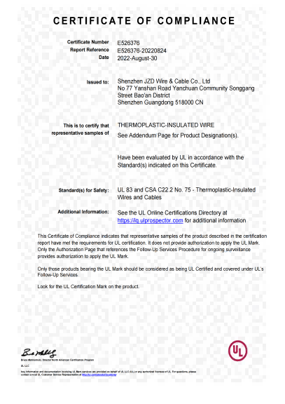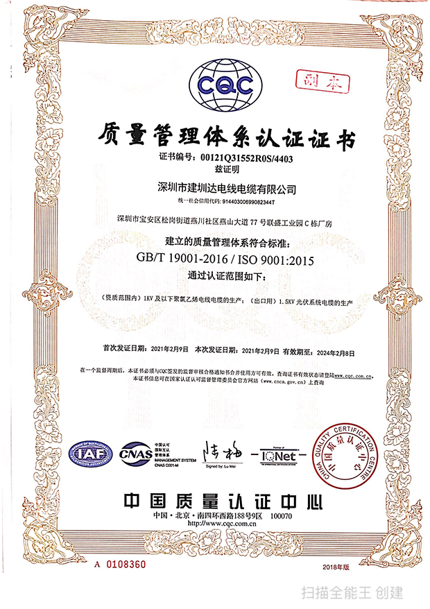 深圳建圳達電線電纜有限公司,成立于2000年,是一家電線電纜制造商,我們通過了世界各地不同市場的多數(shù)認證,如:CCC、RoHS、CB、SAA、TUV、VDE、PSE、BPS、UL、CSA。我們根據(jù)定制產(chǎn)品不斷更新新的認證。經(jīng)過數(shù)十年的發(fā)展,我們與來自世界各地的客戶建立了長期的合作關系。我們曾經(jīng)是菲律賓機場,,柬埔寨的電力站,美國的醫(yī)院,工廠,埃塞俄比亞的水電站項目。我們是一家值得信賴的電線供應商。